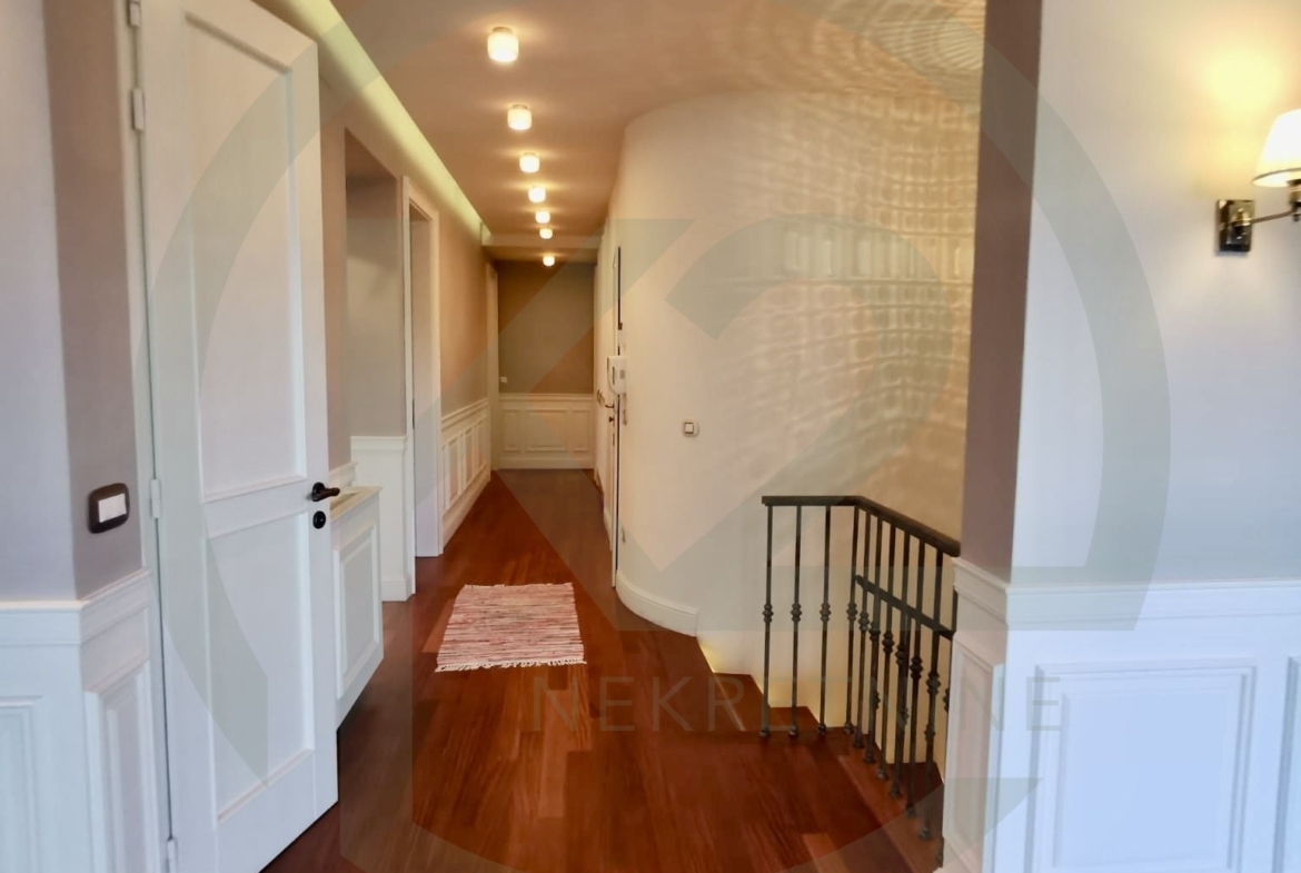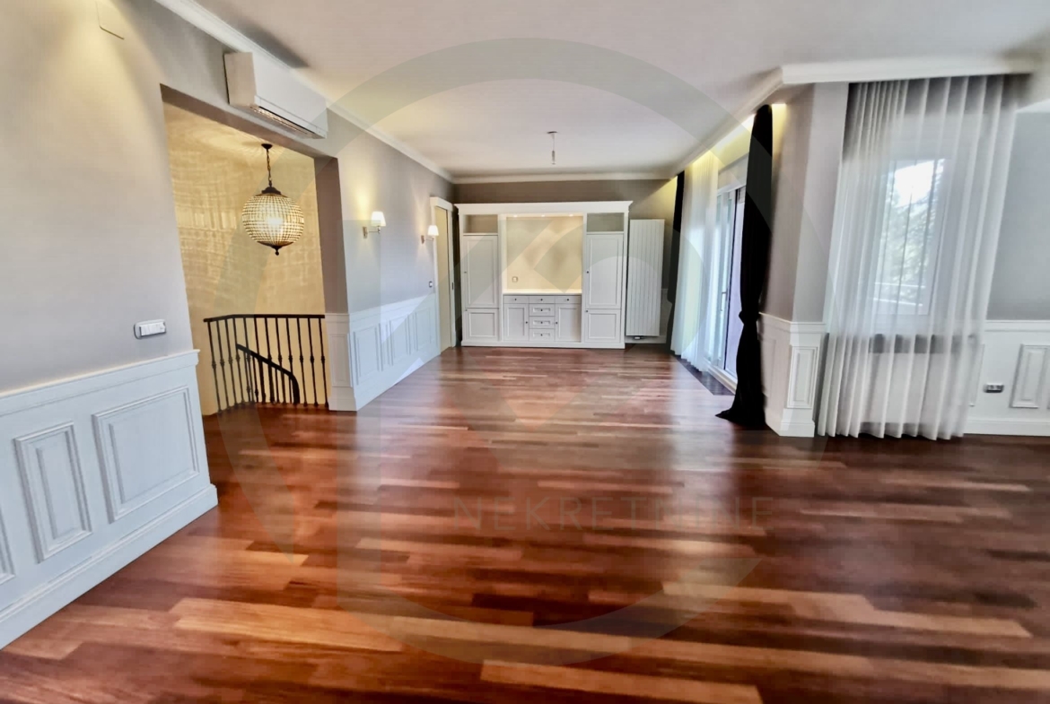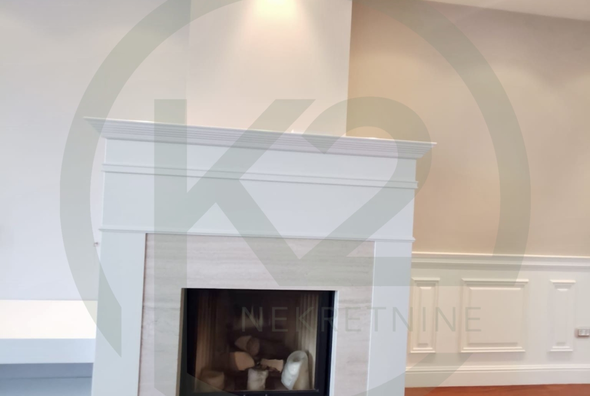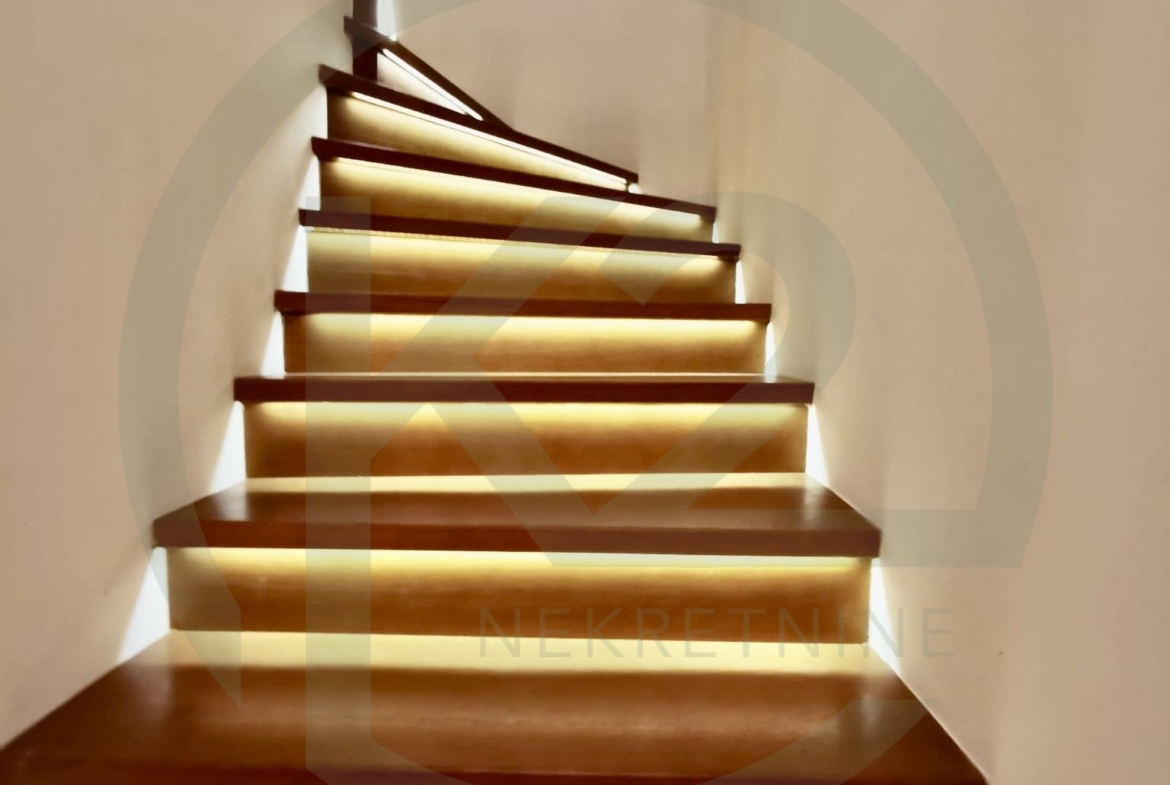 Stan se sastoji od kata gdje se nalazi prostrani dnevni biravak sa kaminom, terasom, blagovaonicom i kuhinjom, hodnika, gostinjskog WC-a, spavaće sobe sa vlastitom kupaonicom, dodatne sobe, manjeg apartmana koji služi za poslugu te ima vlastiti ulaz a trenutno služi kao vešeraj i ima svoju vlastitu kupaonicu i saunu.