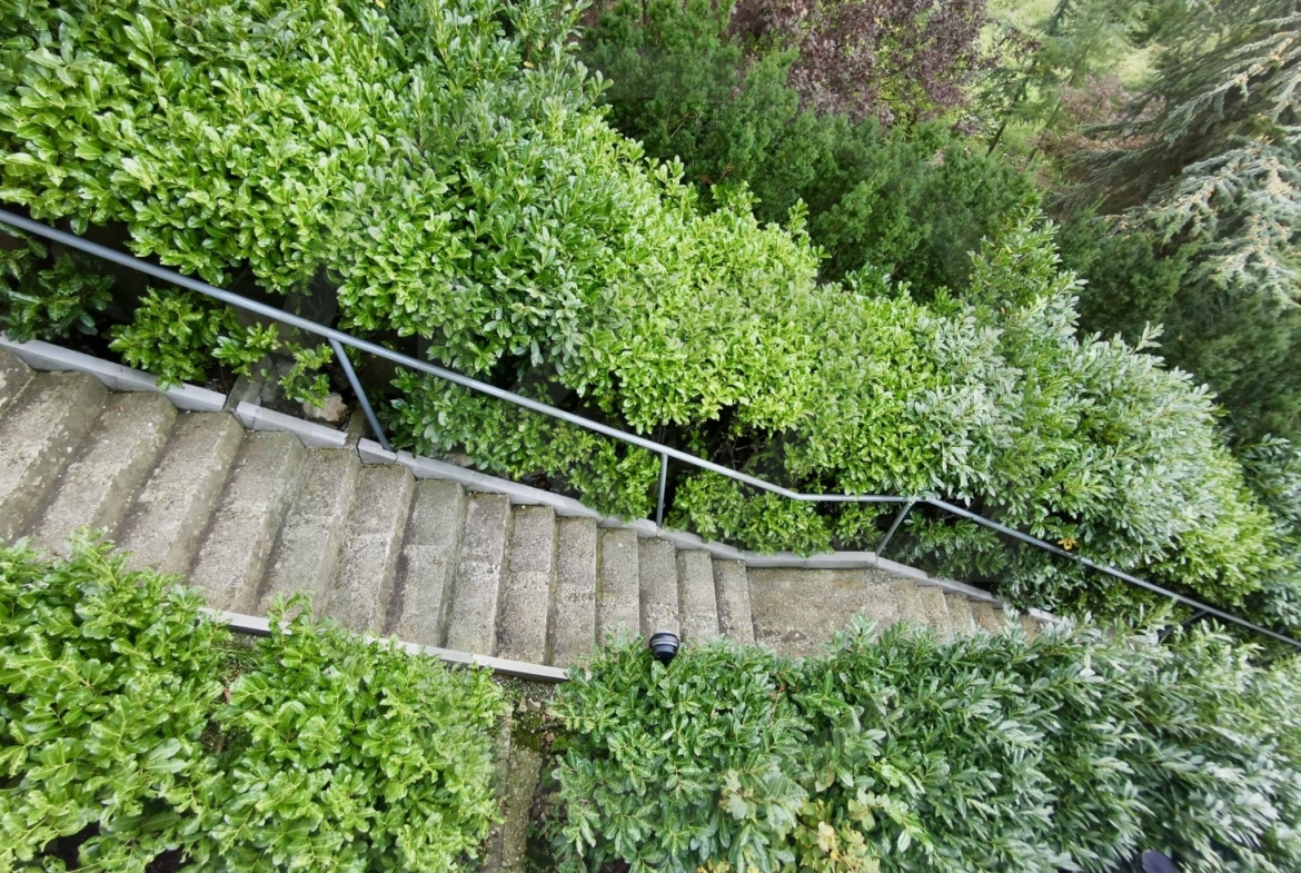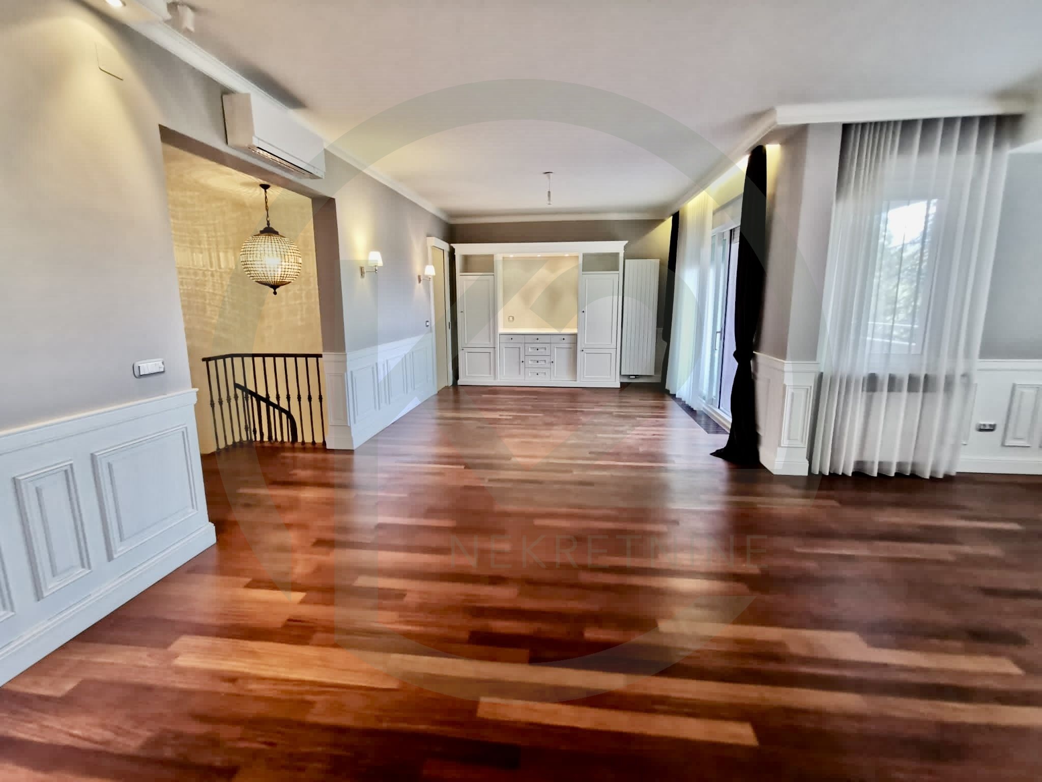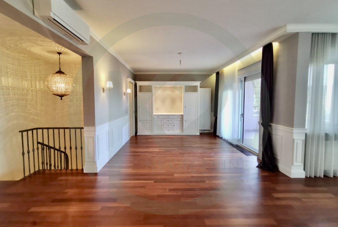 Stan se sastoji od kata gdje se nalazi prostrani dnevni biravak sa kaminom, terasom, blagovaonicom i kuhinjom, hodnika, gostinjskog WC-a, spavaće sobe sa vlastitom kupaonicom, dodatne sobe, manjeg apartmana koji služi za poslugu te ima vlastiti ulaz a trenutno služi kao vešeraj i ima svoju vlastitu kupaonicu i saunu.