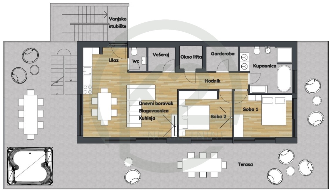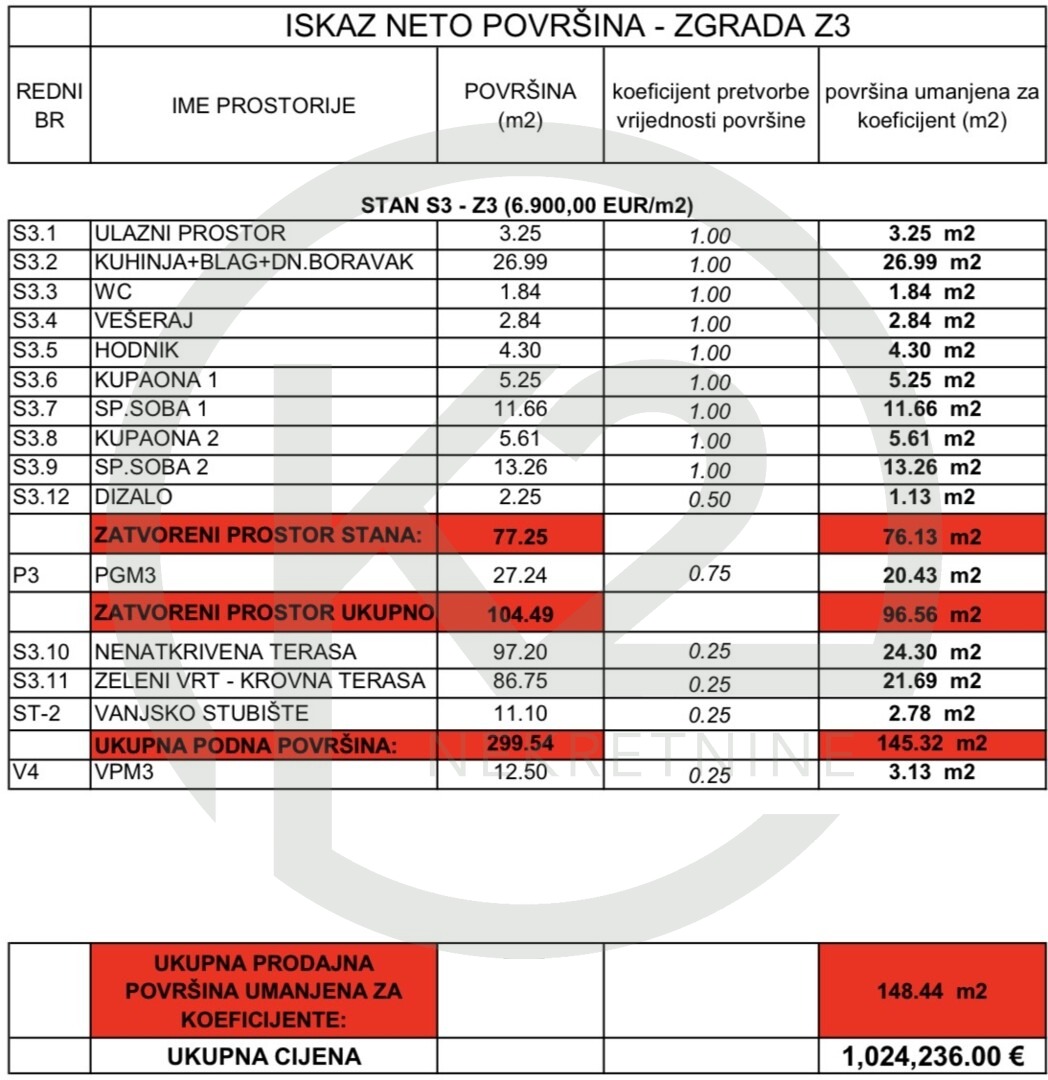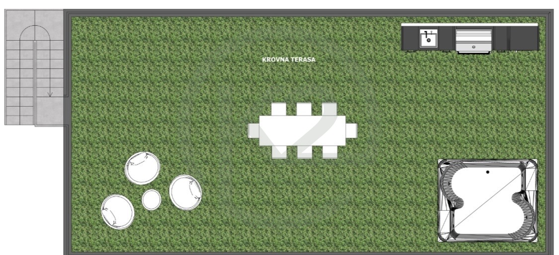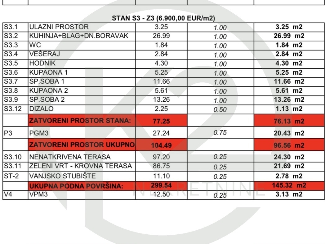 Stan se sastoji od ulaznog prostora, kuhinja+blagovaona+dn. boravak, WC, vešeraj, hodnik, 2 kupaone, 2 spavaće sobe, dizalo, GPM + VPM, vanjsko stubište, nenatkrivena terasa i zeleni vrt – krovna terasa.