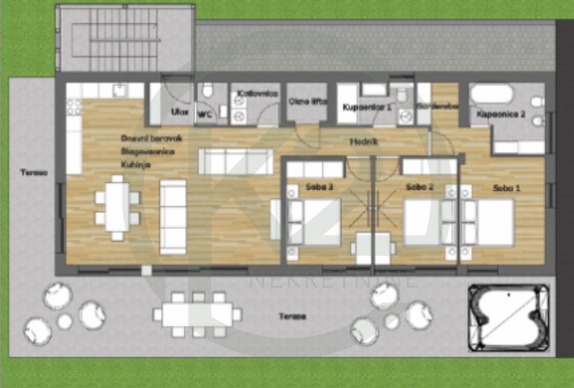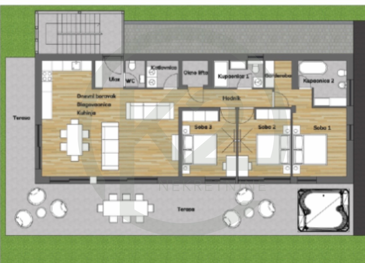 Stan se sastoji od ulaznog prostora, kuhinja+blagovaona+dn. boravak, WC, vešeraj, hodnik, 2 kupaone, spavaća soba sa garderobom+2 spavaće sobe, dizalo, GPM+VPM, tehnički podrum, vanjsko stubište, nenatkrivena terasa i natkrivena terasa.