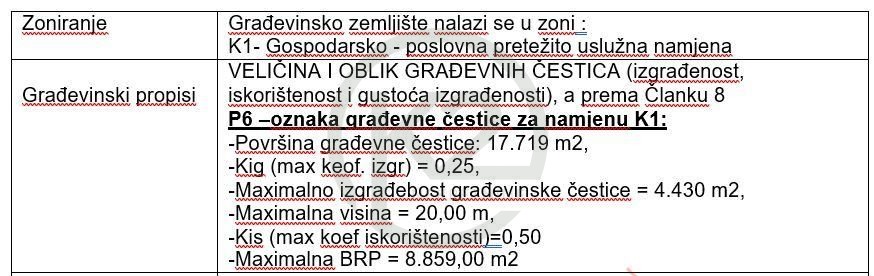 Nalazi se u K1 zoni, Gospodarsko poslovna – pretežito uslužna namjena.