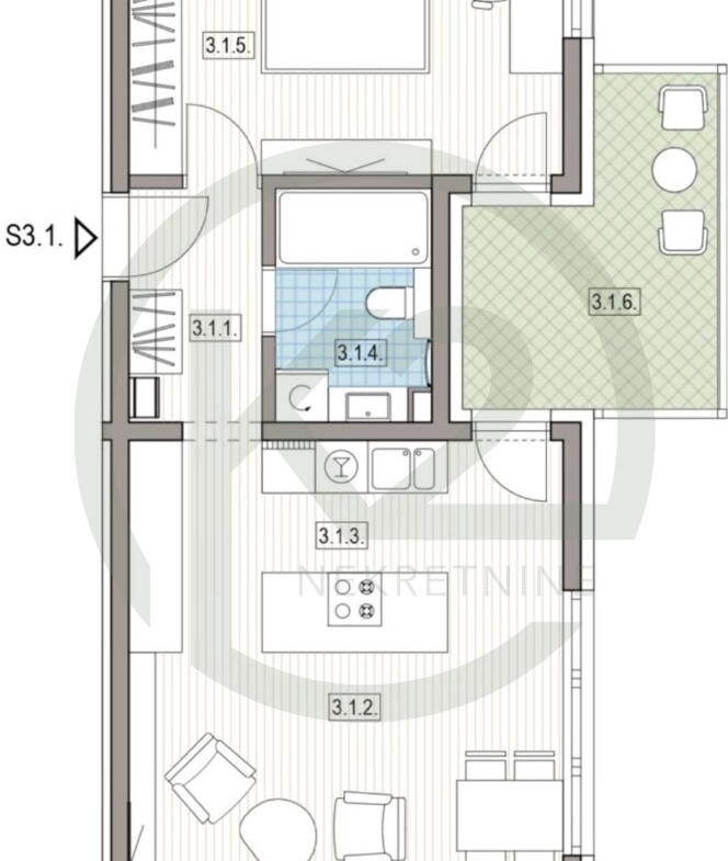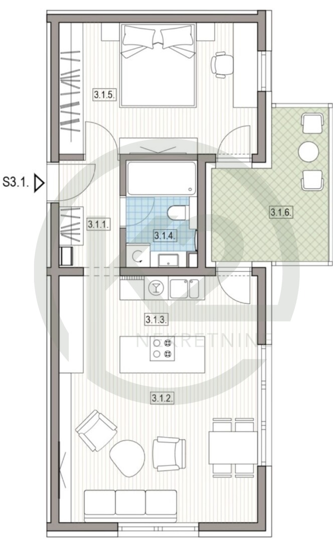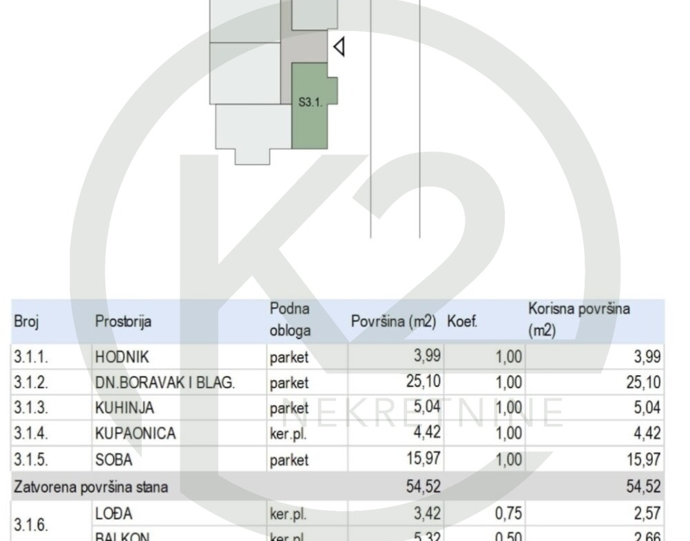 Stan ima 59,75 m2 obračunske površine, korisne površine 63,26 m2, a sastoji se od hodnika, DB+BL, kuhinja, kupaonica, spavaća soba, lođa i balkon.