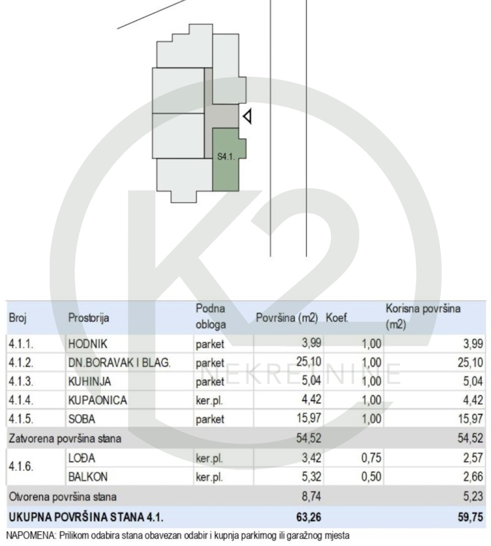 Stan ima 59,75 m2 obračunske površine, korisne površine 63,26 m2, a sastoji se od hodnika, DB+BL, kuhinja, kupaonica, 1 spavaće sobe, lođa i balkon.