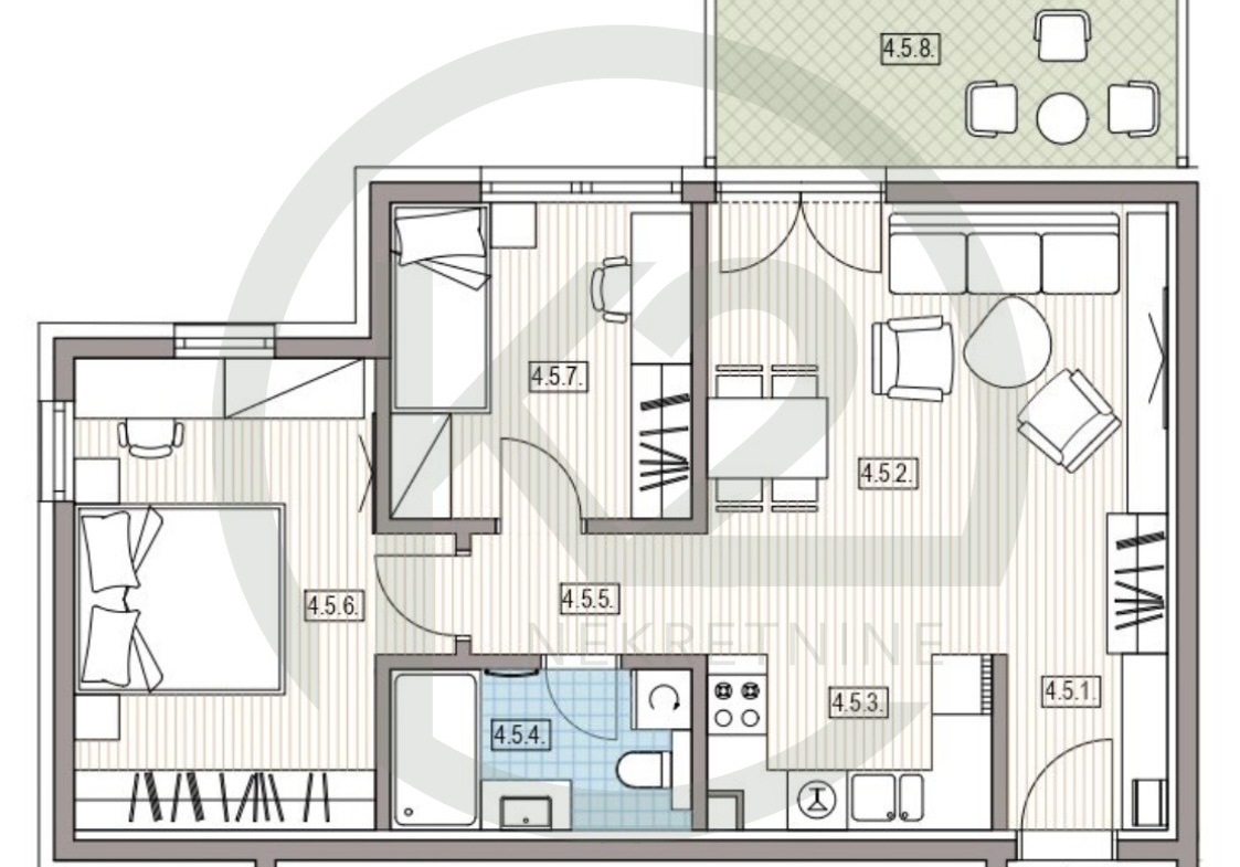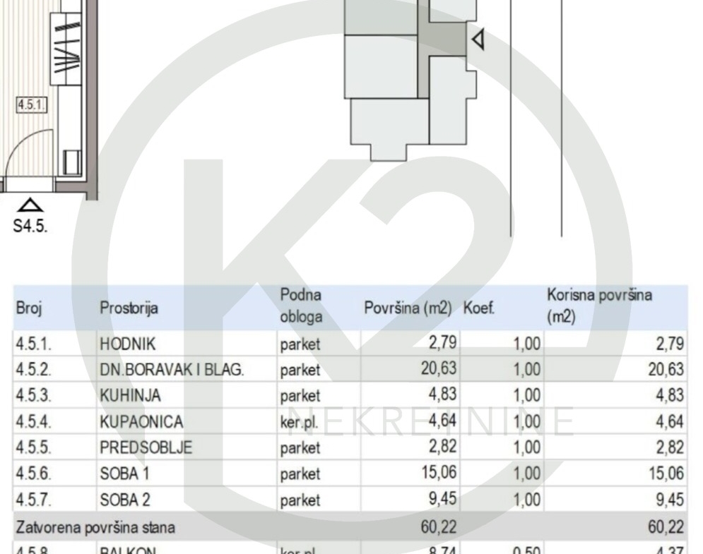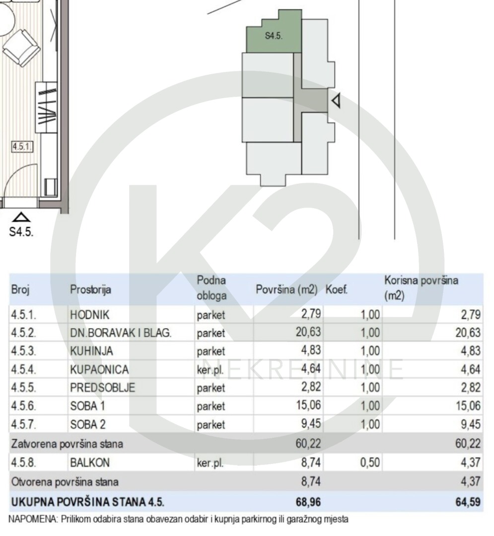 Stan ima 64,59 m2 obračunske površine, korisne površine 68,96 m2, a sastoji se od hodnika, DB+BL, kuhinja, kupaonica, 2 spavaće sobe i balkon.