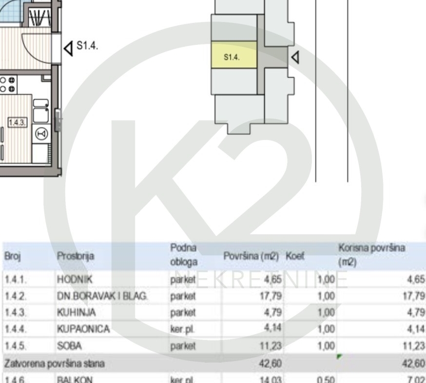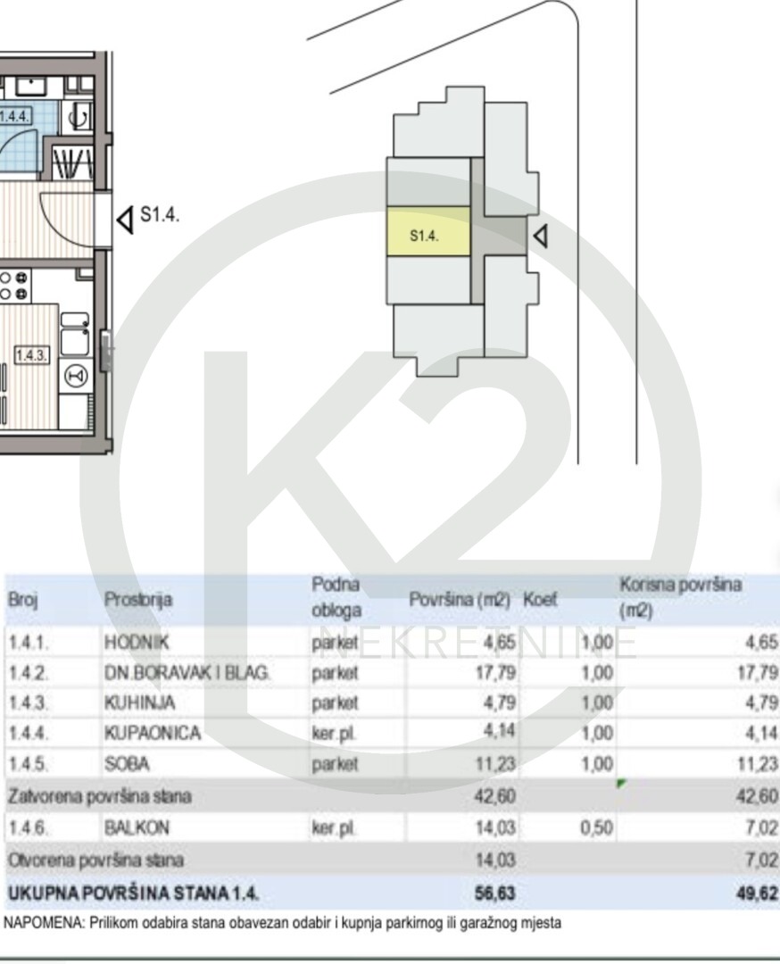 Stan ima 49,62 m2 obračunske površine, korisne površine 56,63 m2, a sastoji se od hodnika, DB+BL, kuhinja, kupaonica, spavaća soba i balkon.
