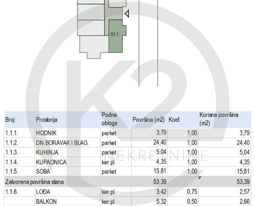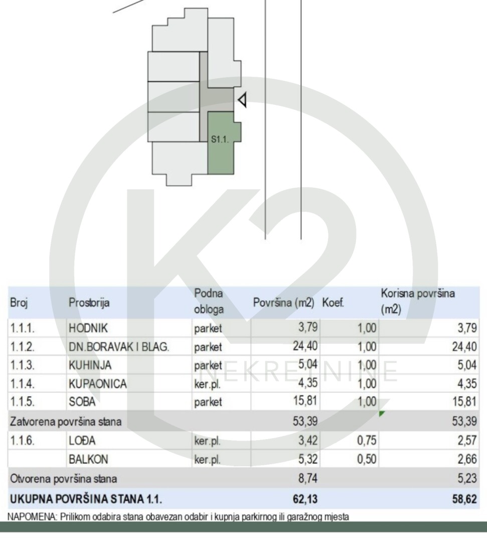 Stan ima 58,62 m2 obračunske površine, korisne površine 62,12 m2, a sastoji se od hodnika, DB+BL, kuhinja, kupaonica, spavaća soba, lođa i balkon.