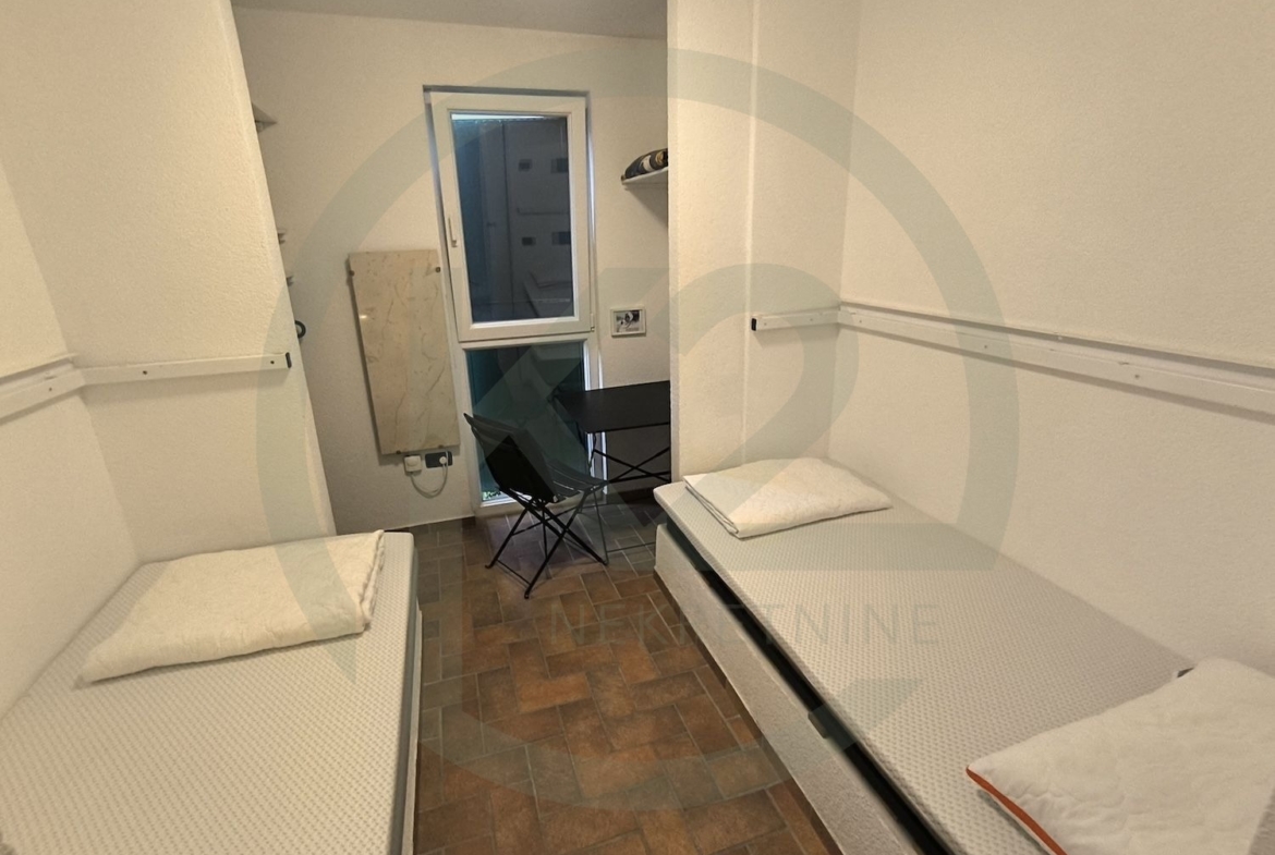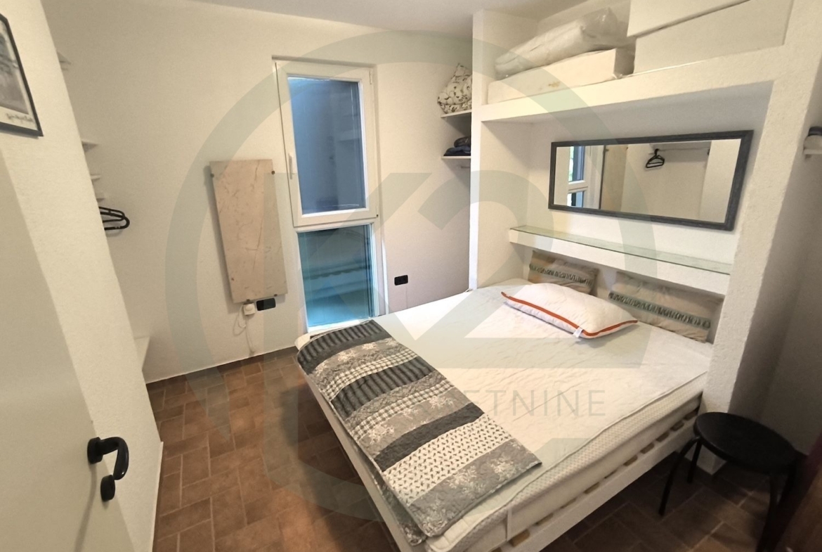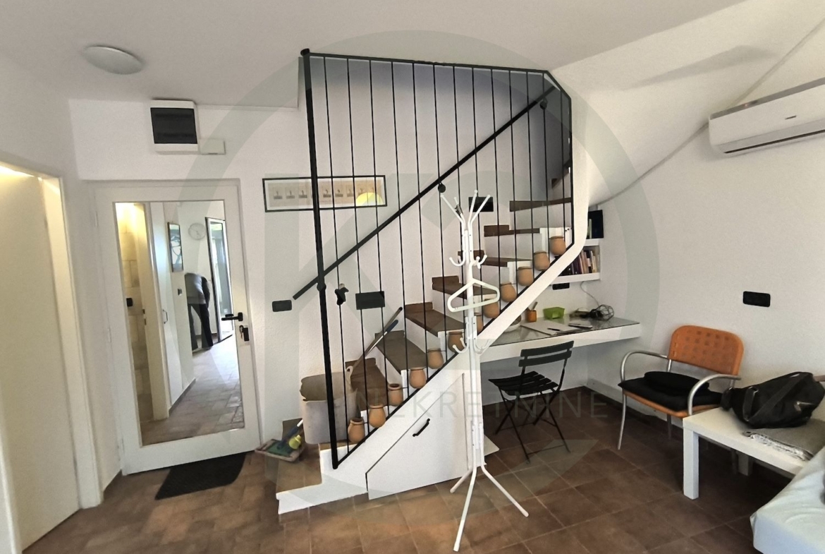 Kuća je potpuno namještena i sastoji se od dnevnog boravka i kuhinje 22,72 m2, kupaonice u prizemlju 3m2, spremište 1m2, terasa u prizemlju 6 m2, spavaća soba 8,3 m2, druga spavaća soba 8,2 m2, kupaonica na prvom katu 3 m2, terasa na drugom katu 12 m2.