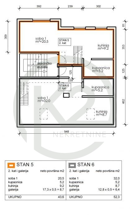 Stan se sastoji od 2 sobe, 2 kuhinje sa blagovaonom, 2 kupaone+galerija.