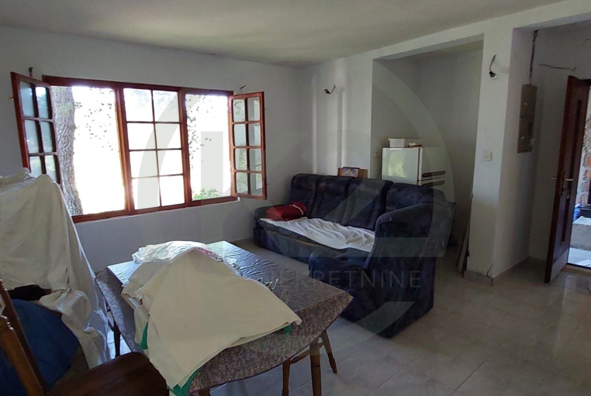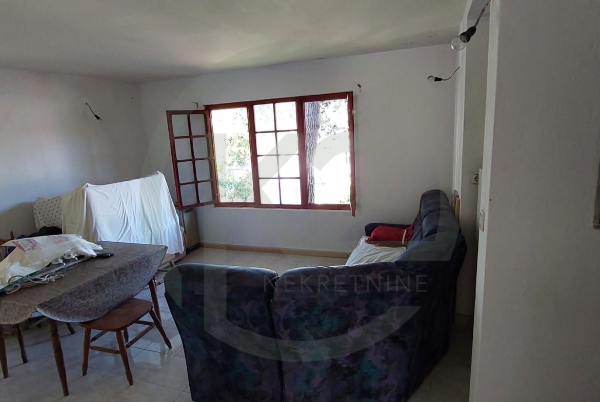 u prizemlju se nalazi uređen apartman 62 m2 sa svim priključcima te se se sastoji od dnevnog boravka sa kuhinjom i blagovaonicom, dvije sobe i izlaz na terasu, dok je preostali dio kuće roh-bau.
