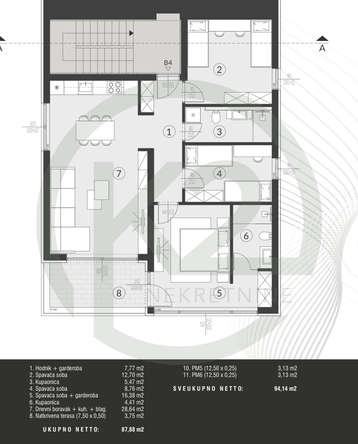 Projekat se sastoji od dvosobnih (1S+DB), trosobnih (2S+DB) i četverosobnih (3S+DB) stanova, pri čemu svaki stan ima pripadajuće parkirno mjesto. Uz dvosoban stan pripadajuće jedno parkirno mjesto, uz trosoban također jedno parkirno mjesto dok u četverosoban stan pripadaju dva parkirna mjesta.
