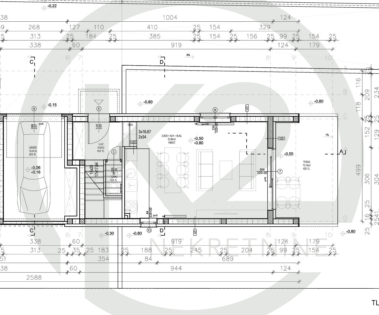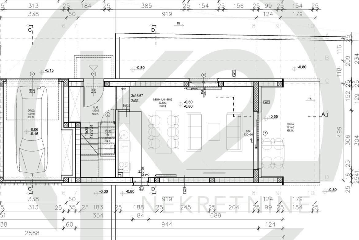 Podovi kupaonice, WC-a i kuhinje i ulazni prostor će biti obloženi keramičkim poločicama I. klase. Podovi terasa protukliznom keramikom također I. klase.