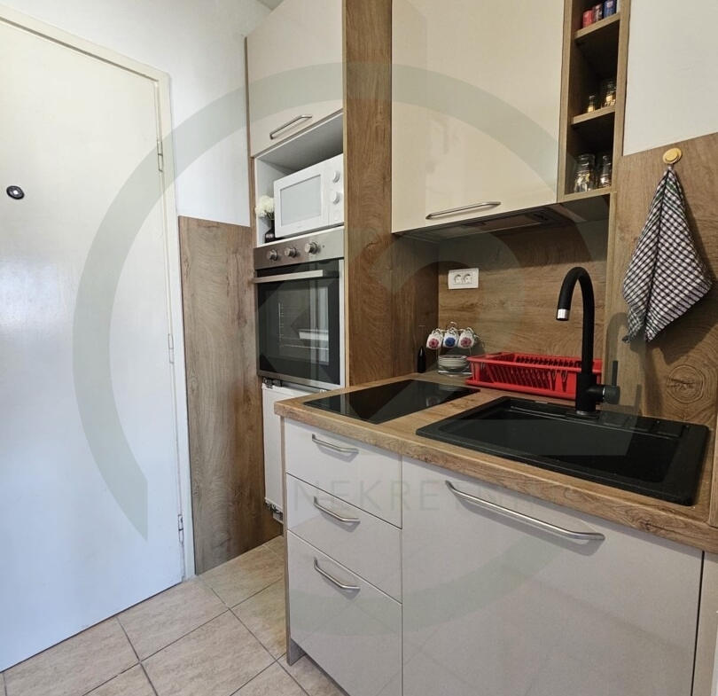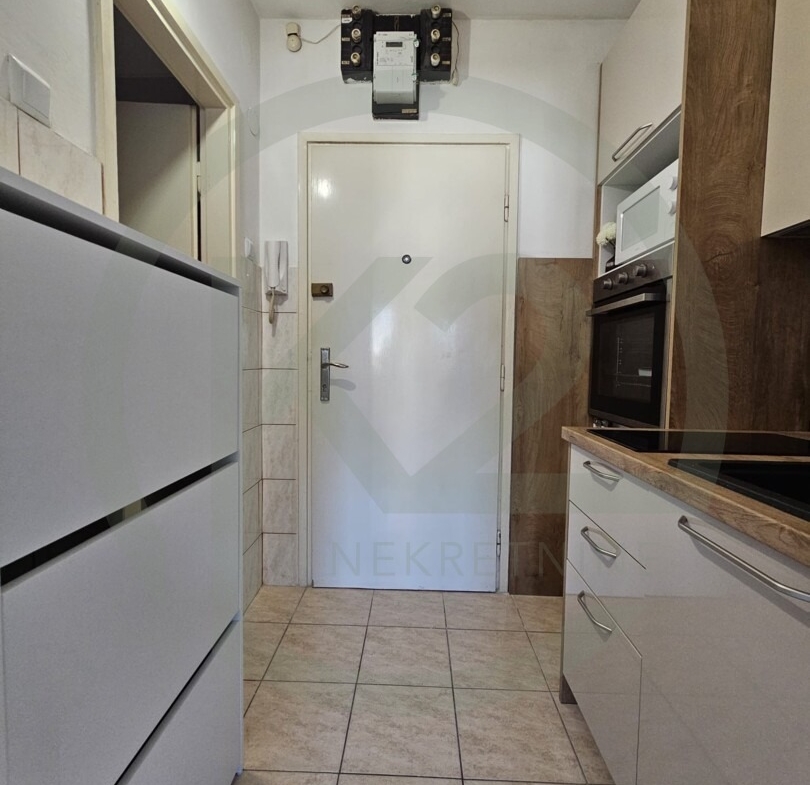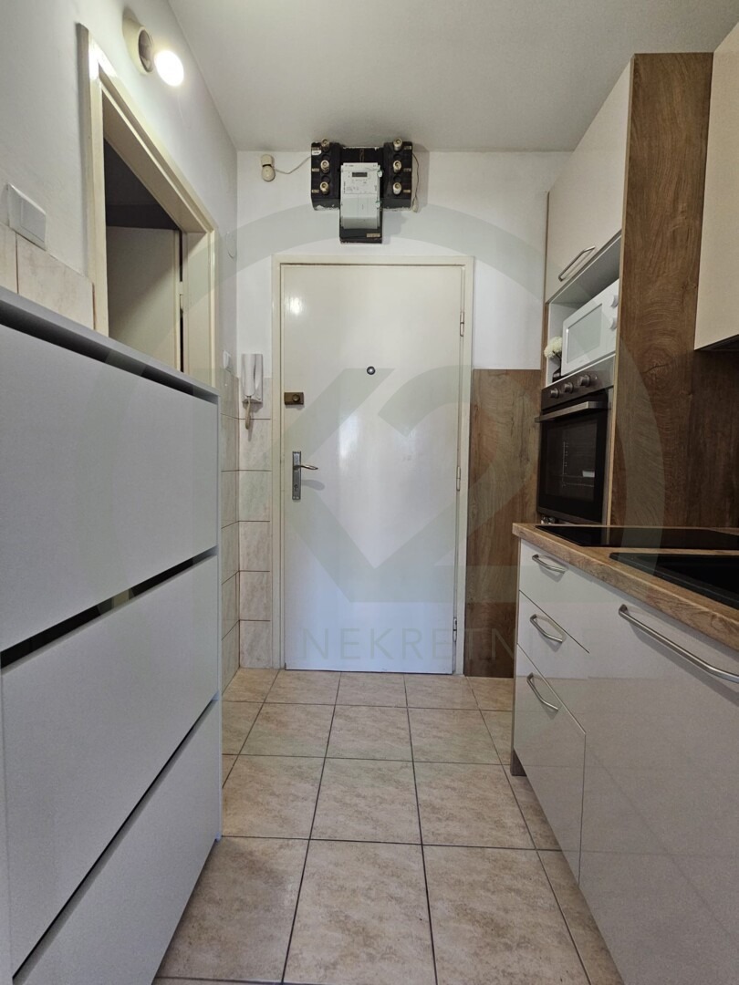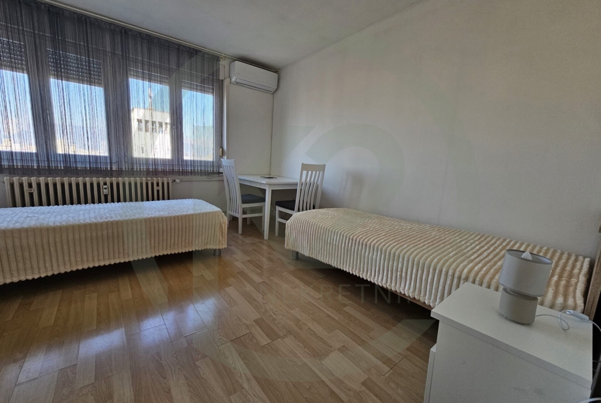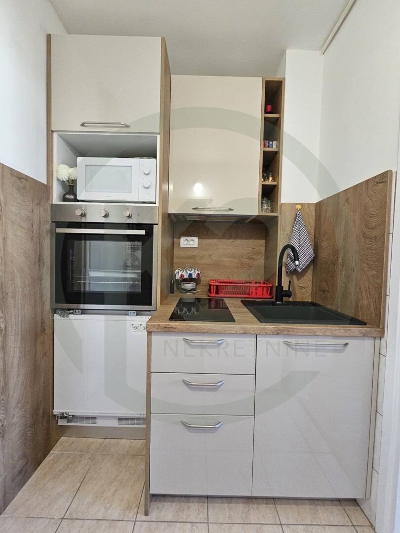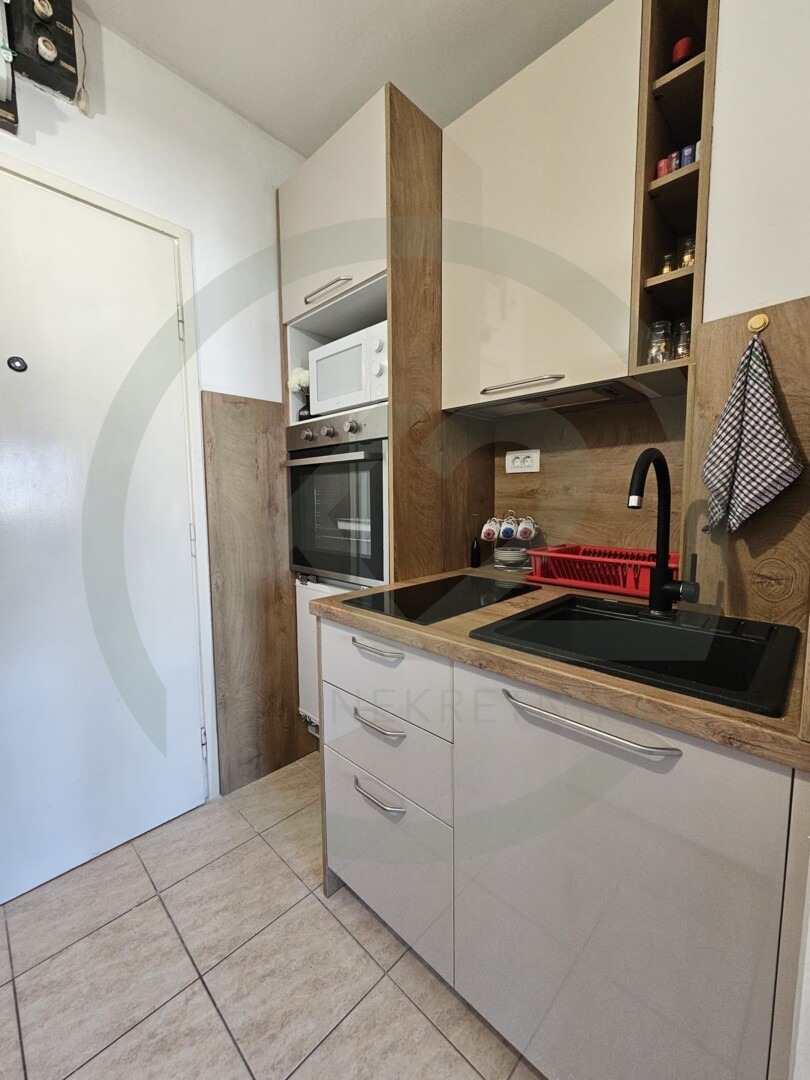 Stan je smješten na 9. katu zgrade sa liftom, kompletno novo namješten sa ugradbenom kuhinjom, indukcijskom pločom, ugradbenim frižiderom, mikrovalnom, perilica rublja u  kupaonici, dva zasebna kreveta.