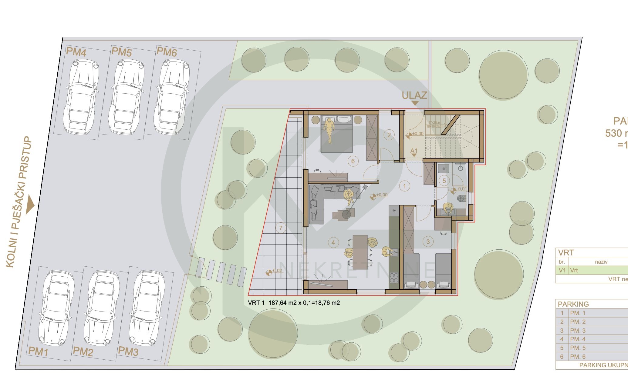 Raspored prostorija: Ulaz, prostrani dnevni boravak s otvorenom kuhinjom, dvije spavaće sobe, jedna kupaonica i praktična ostava.