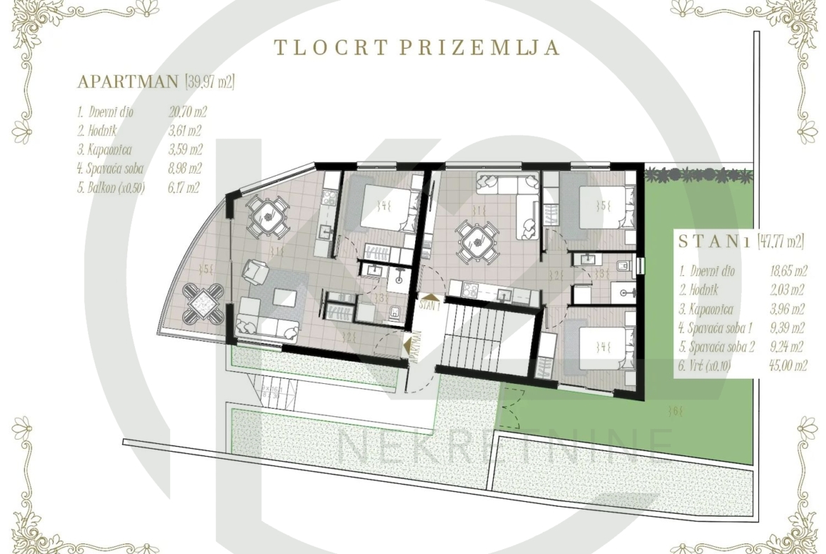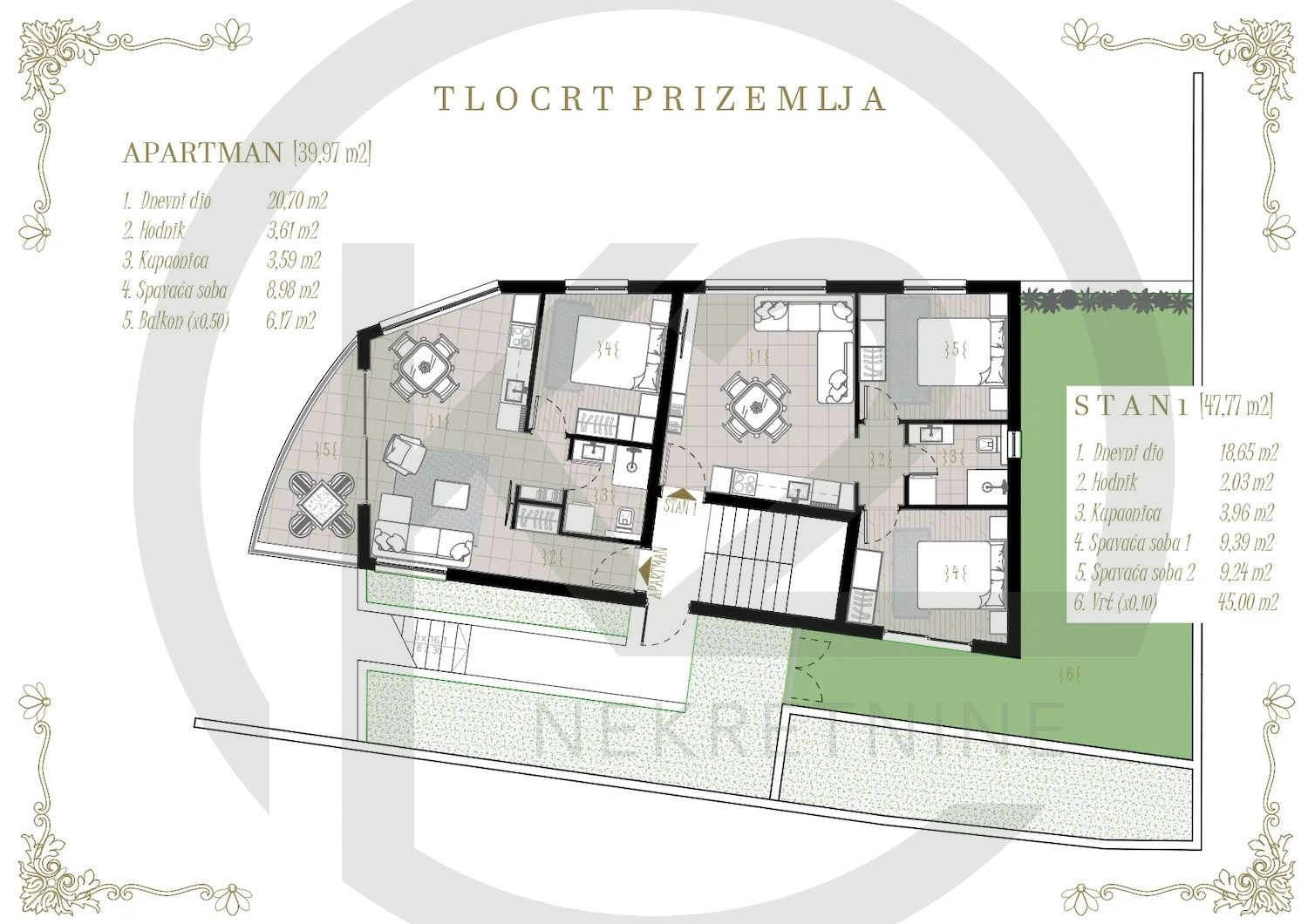 Svaki stan opremljen je keramikom velikog formata, kupaonskom opremom 1.klase, komarnicima, PVC stolarijom sa troslojnim staklom i klimom. Armiranobetonska konstrukcija, zidovi betonski blok i izolacija EPS 8 cm.