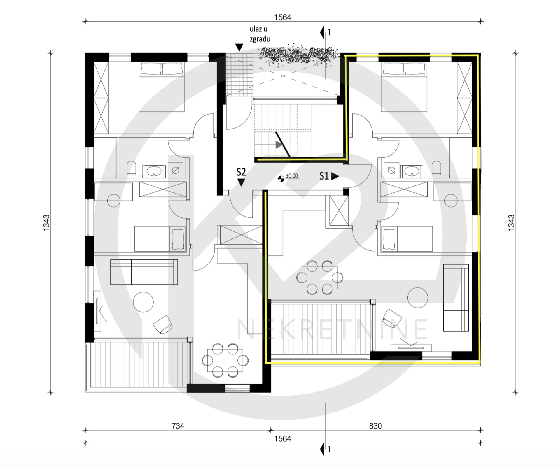 Predmetni stan oznake S1 se nalazi u visokom prizemlju (visina prvog kata) se sastoji od ulaznog prostora, kupaonice sa WC-om, veće spavaće sobe, manje spavaće sobe, dnevnog boravka sa kuhinjom i blagovaonicom i loggie.