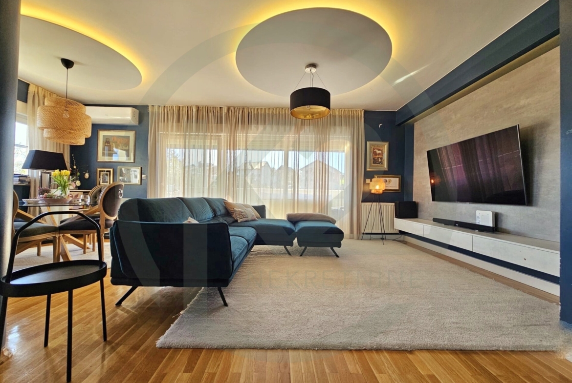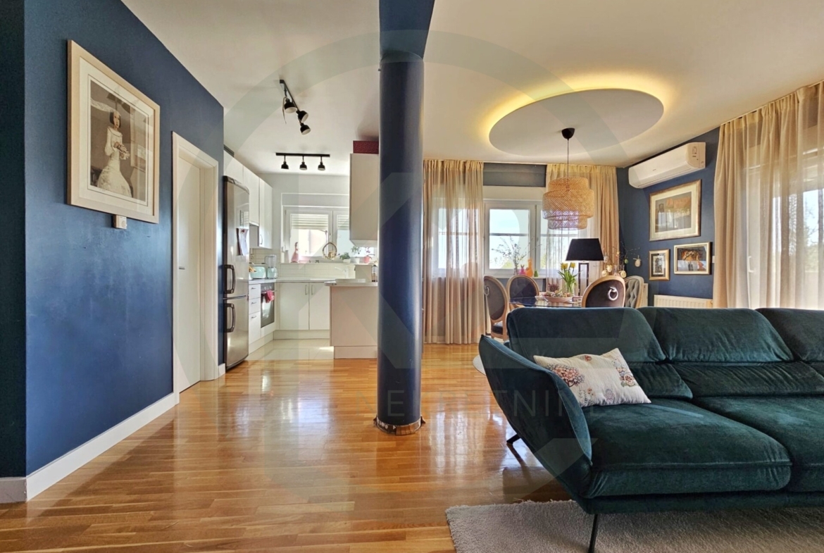 Predmetni stan se nalazi na prvom katu i sastoji se od ulaznoh prostora sa ugradbenim ormarima i gostinjskim WC-om koji je pretvoren u garderobu ali se može vratit u prvobitno stanje, prostranog dnevnog boravka sa kuhinjom i blagovaonicom, spremišta u stanu, hodnika koji odvaja privatni dio stana gdje su smještene dvije spavaće sobe i kupaonica sa WC-om.