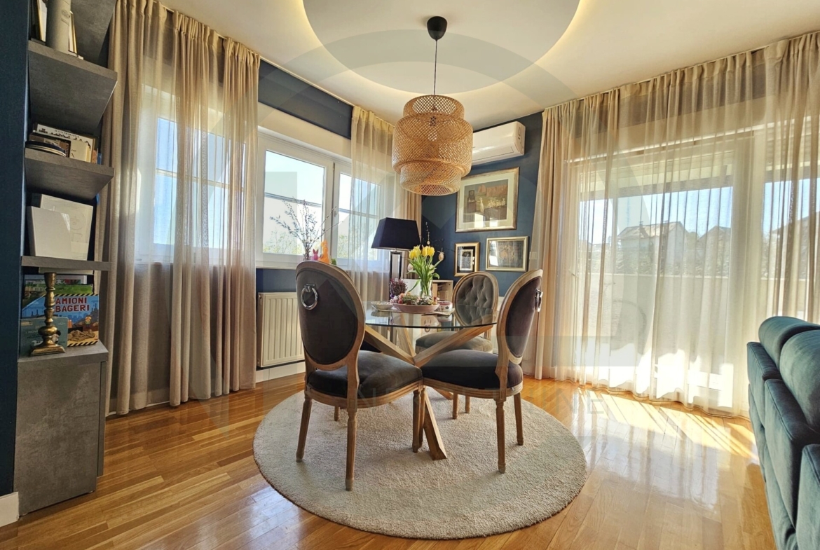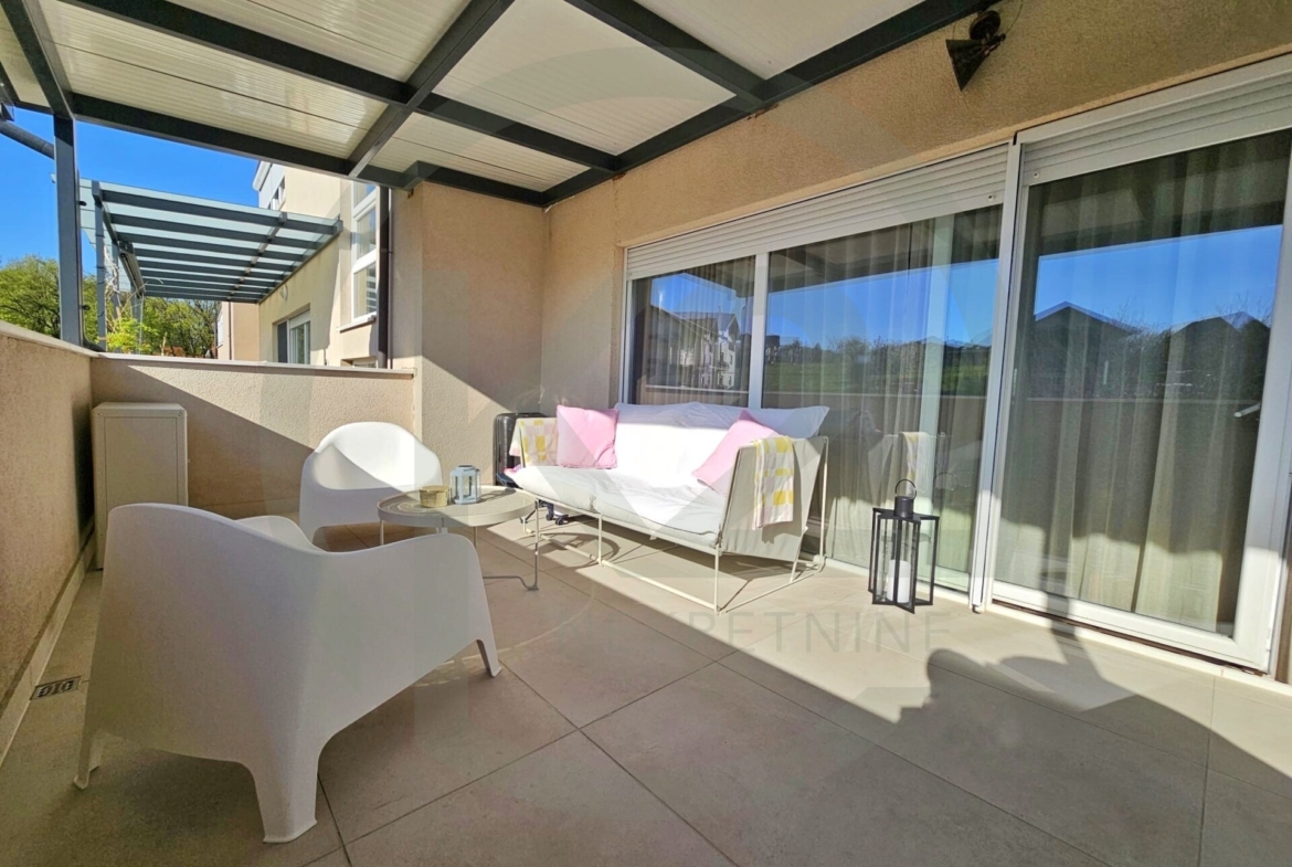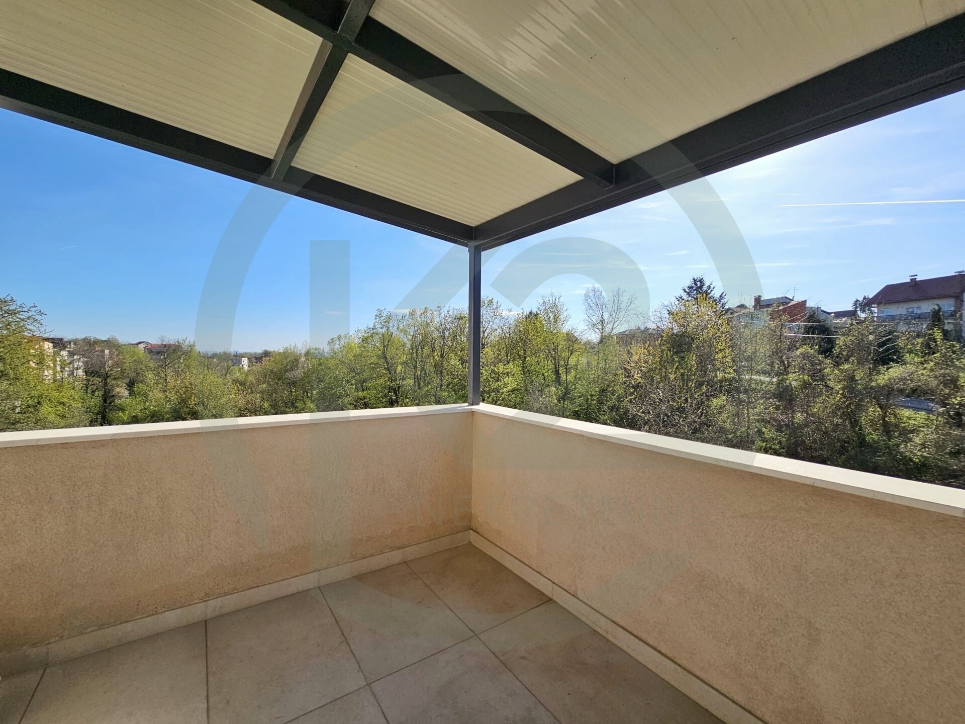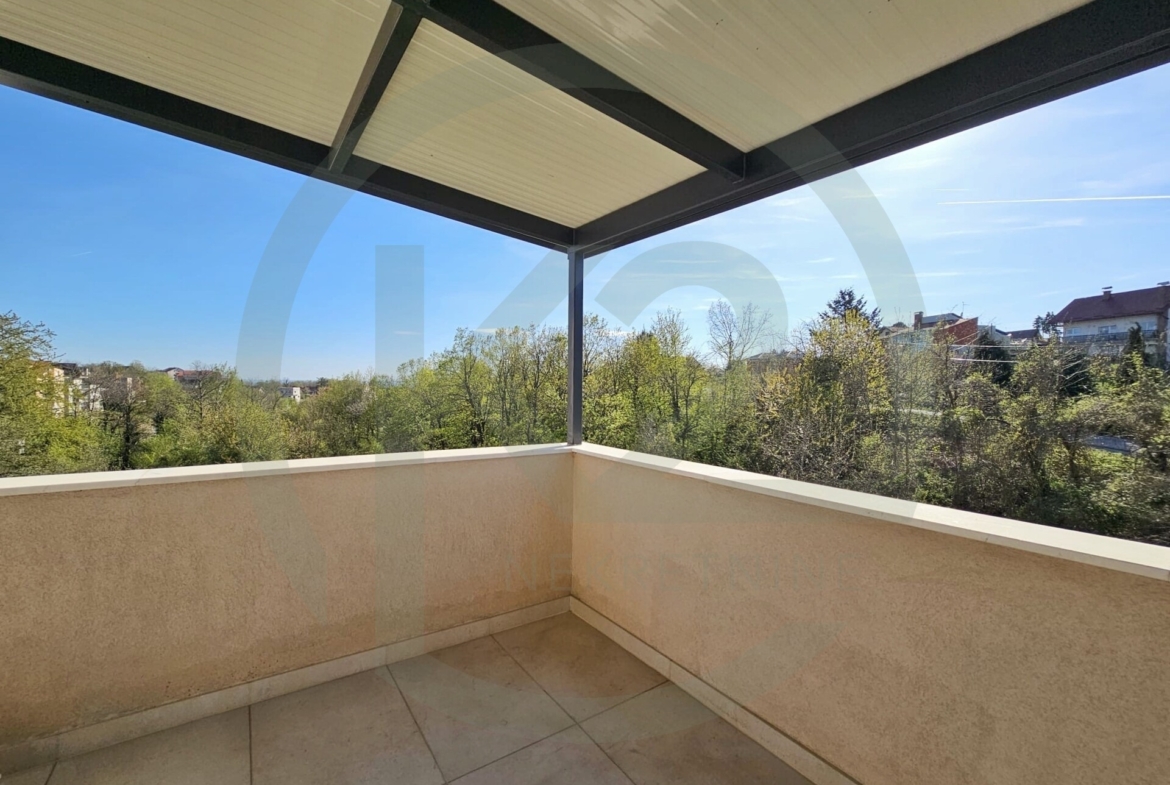 Iz dnevnog boravka se izlazi na veliku natkrivenu terasu sa pogledom na zelenilo. U stanu je zajamčena privatnost bez susjednih pogleda.