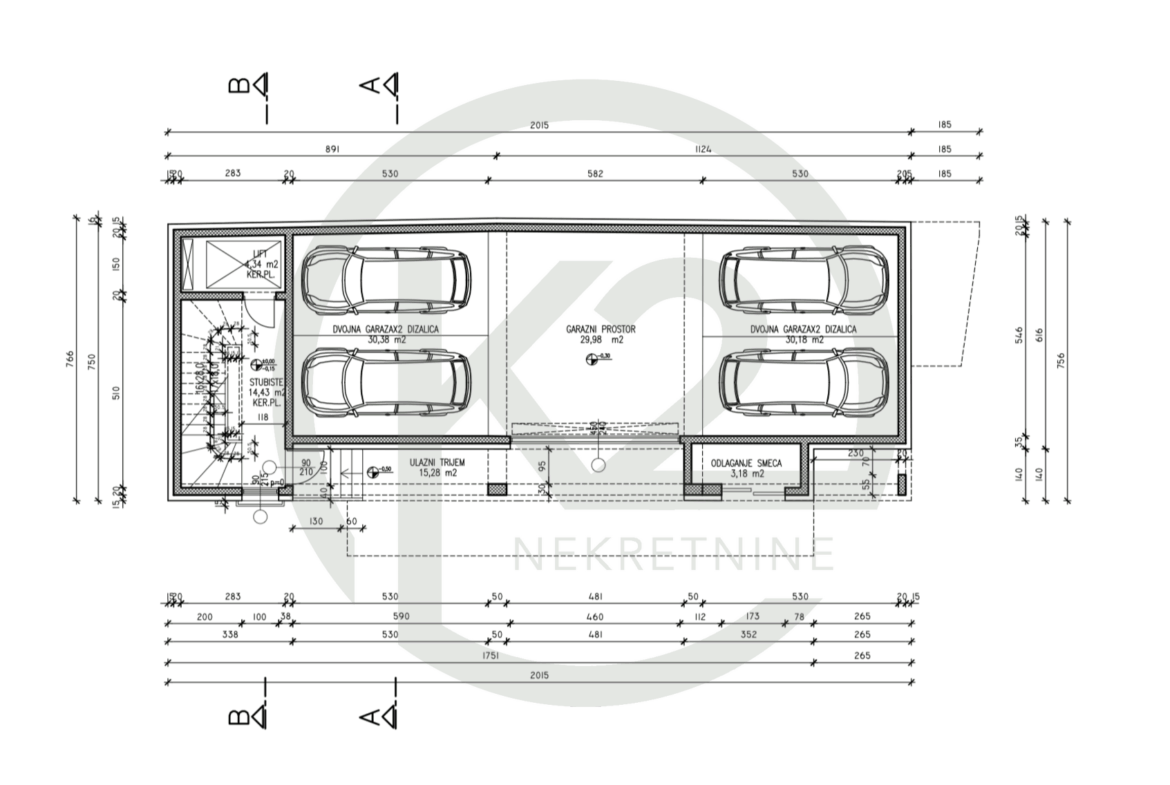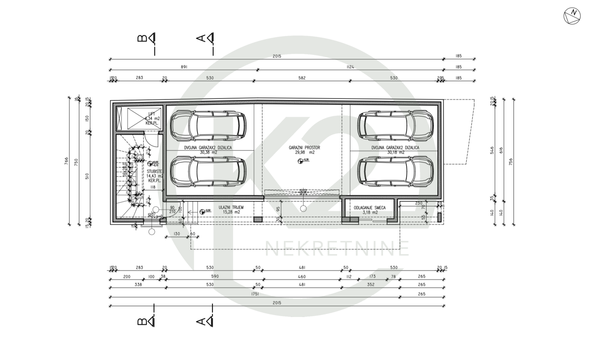 U prizemlju zgrade se nalaze parkirna mjesta sa autodizalicama, te svakom stanu pripadaju dva parkirna mjesta.