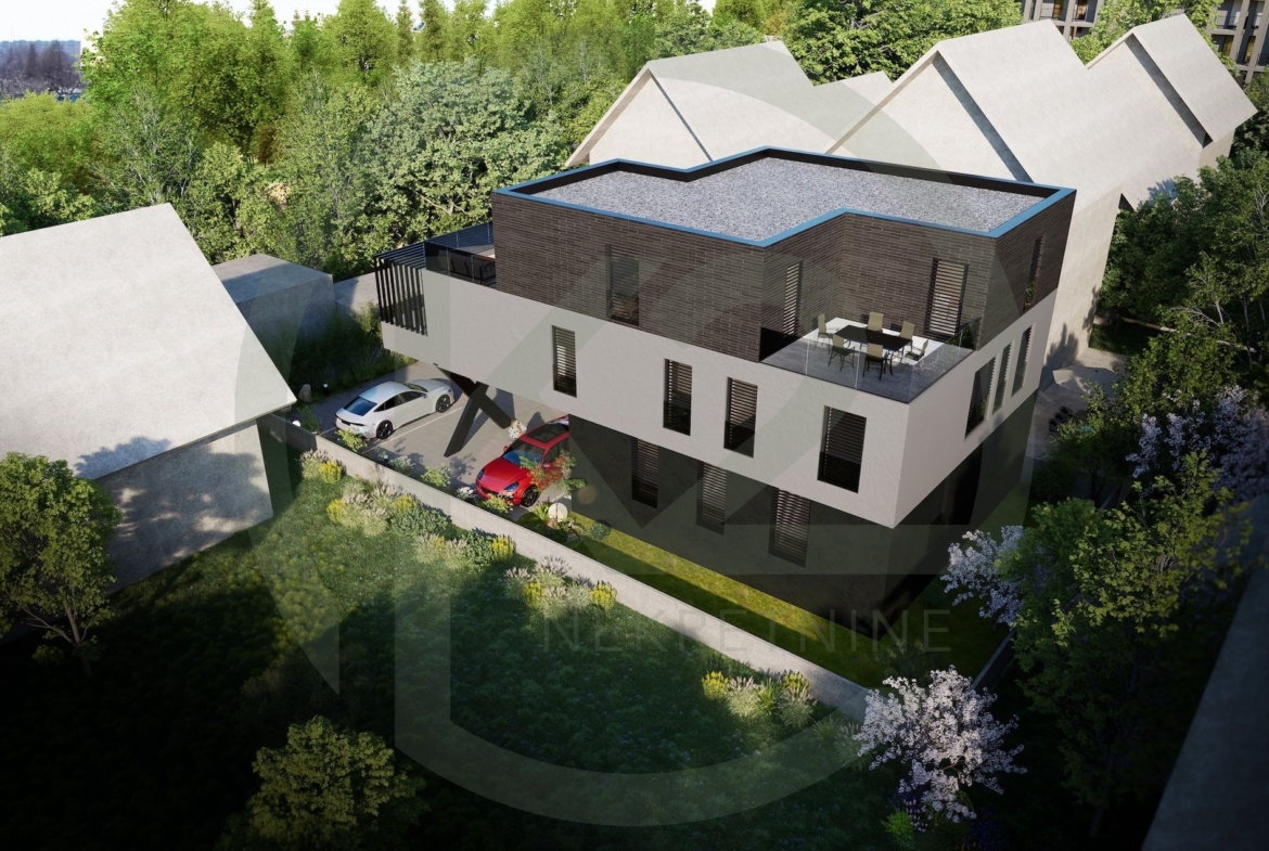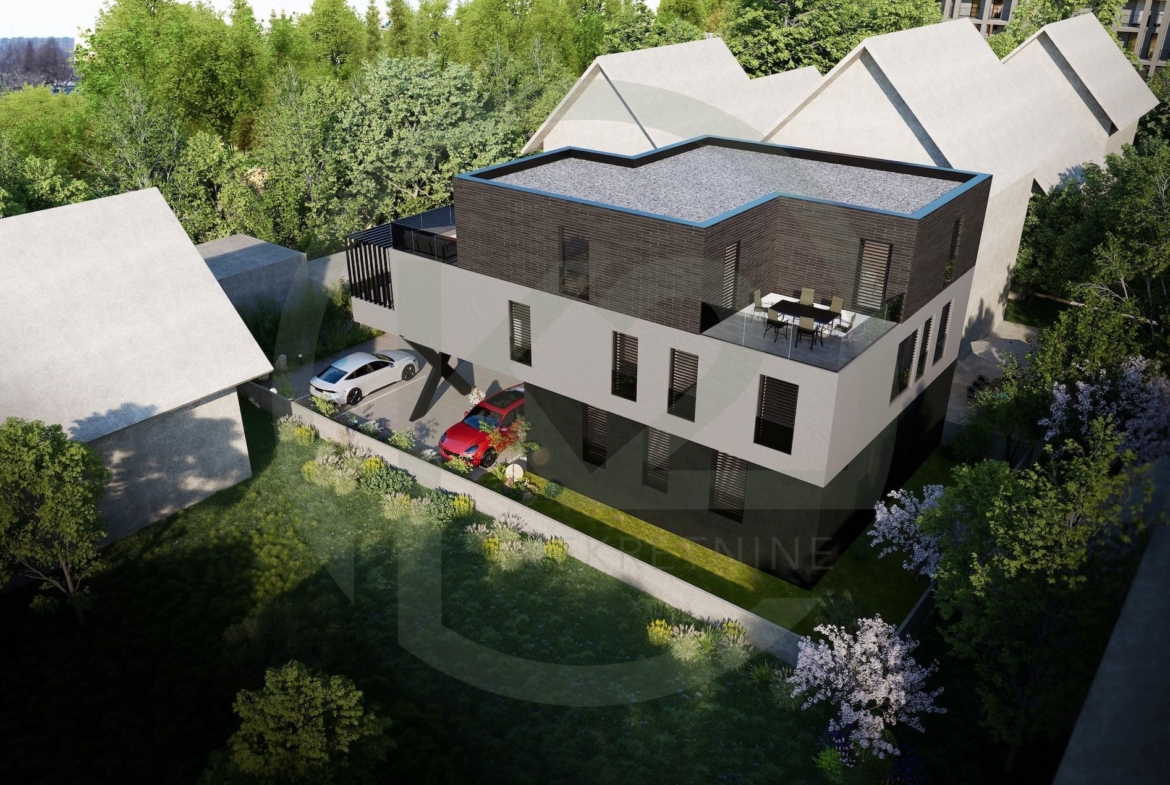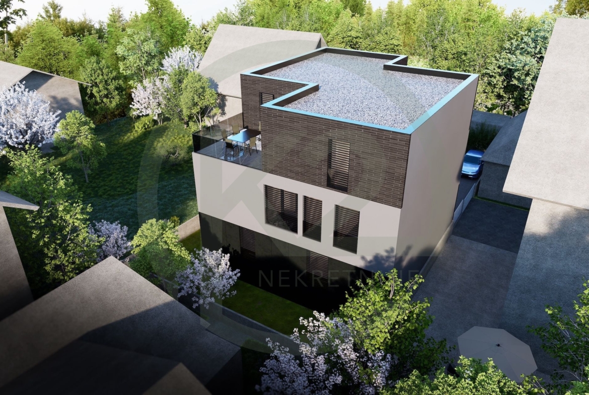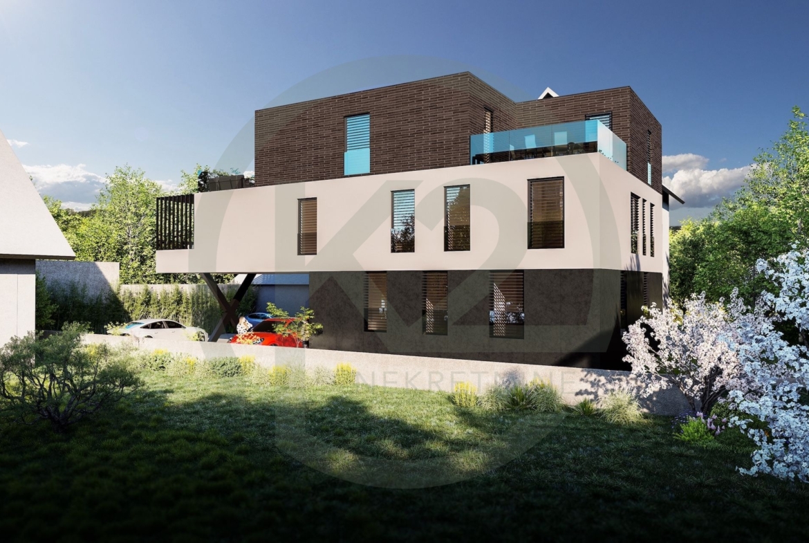Stan je smješten u manjoj stambenoj zgradi sa ukupno 6 jedinica na kraju slijepe ulice na Srednjacima, zgrada je razvijena u tri etaže, suteren, prizemlje, prvi i drugi kat. Vrlo kvalitetna armiranobetonska gradnja, sa PVC stolarijom, podnim grijanjem, dizalicama topline, keramikom i sanitarijama visoke klase.