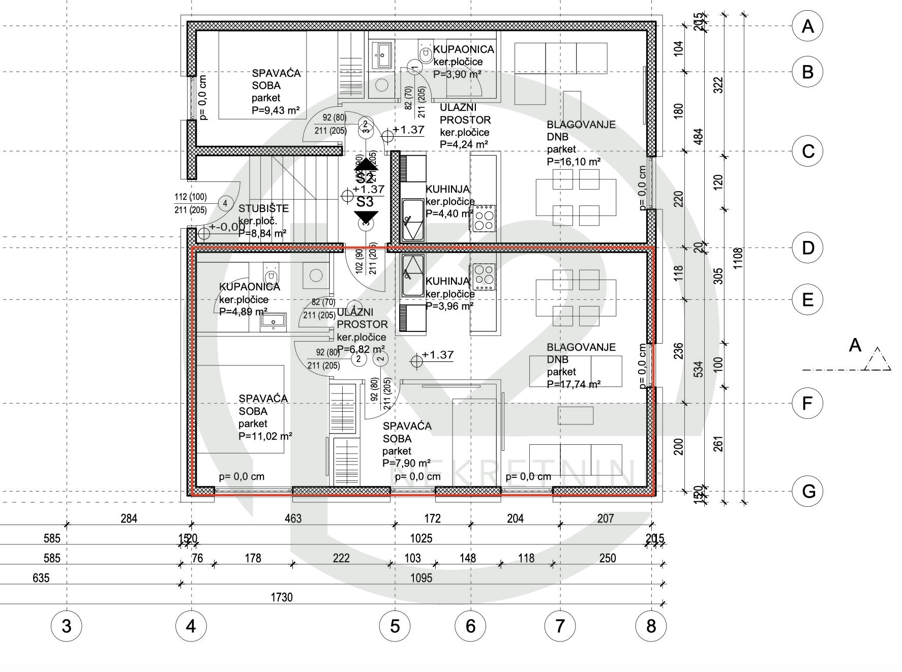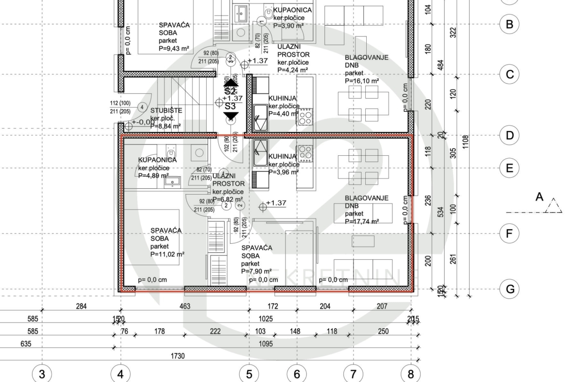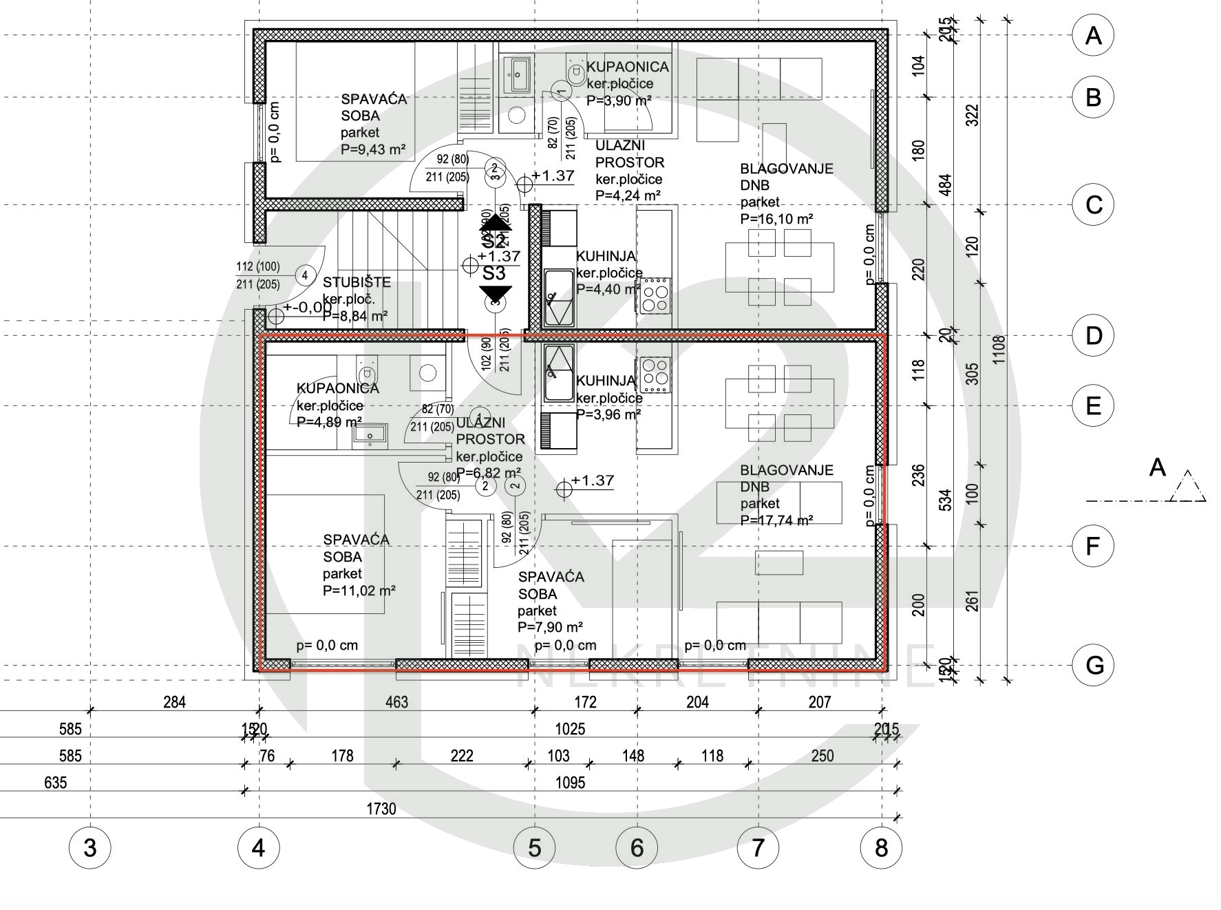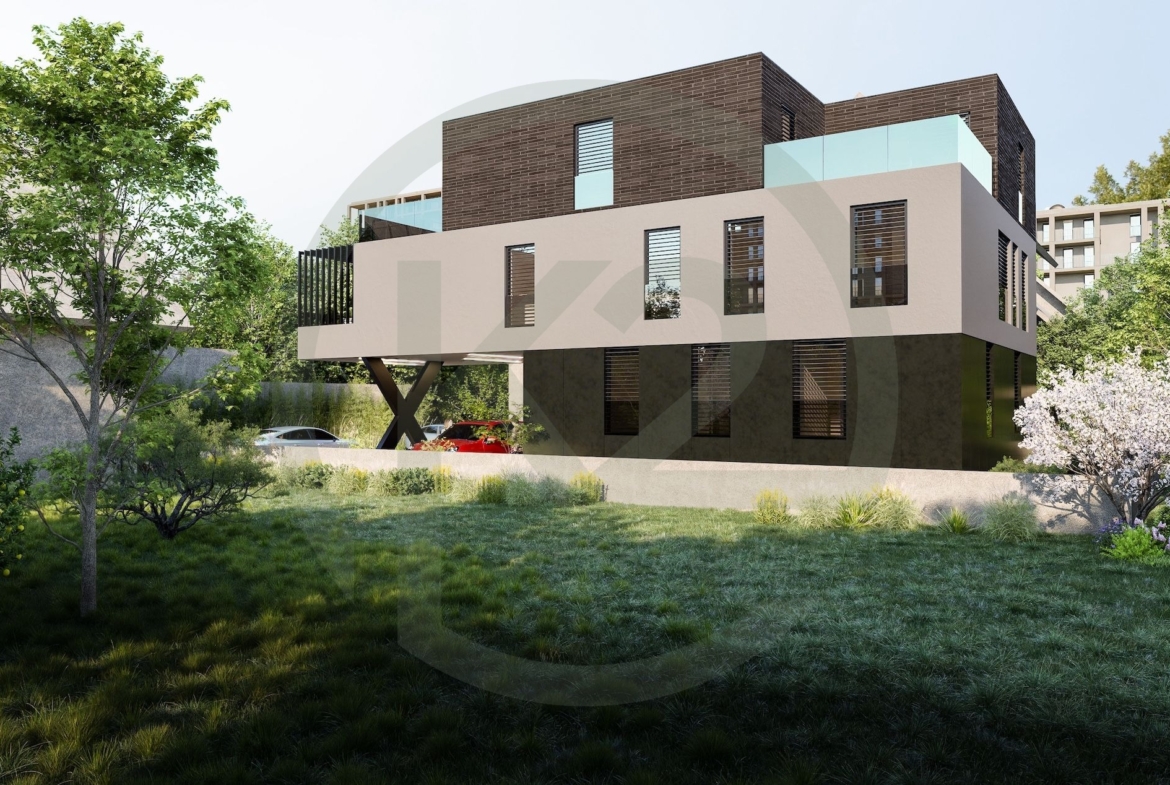 Stan je smješten u manjoj stambenoj zgradi sa ukupno 6 jedinica na kraju slijepe ulice na Srednjacima, zgrada je razvijena u tri etaže, suteren, prizemlje, prvi i drugi kat. Vrlo kvalitetna armiranobetonska gradnja, sa PVC stolarijom, podnim grijanjem, dizalicama topline, keramikom i sanitarijama visoke klase.